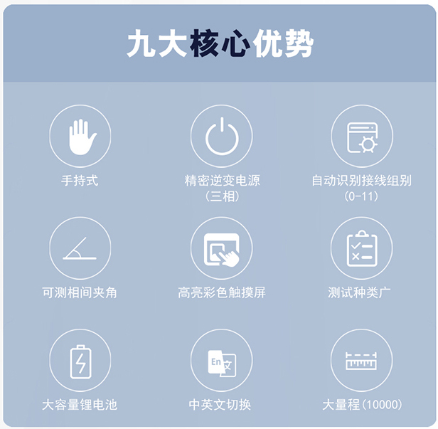 2、 采用三相輸出電壓,提高測(cè)試速度,可以測(cè)量相間夾角,自動(dòng)識(shí)別變壓器接線組別0-11。