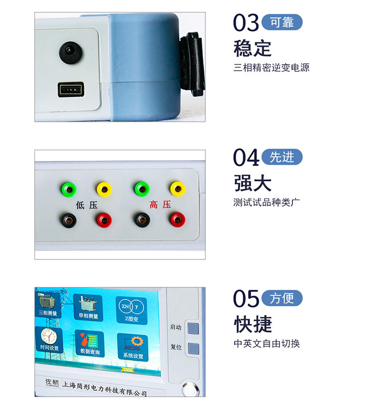 4、 采用自制精密三相逆變電源,具有高低壓反接保護(hù),變壓器匝間短路保護(hù),分接開(kāi)關(guān)分合不到位保護(hù),輸出全短路保護(hù),增加儀器穩(wěn)定性。