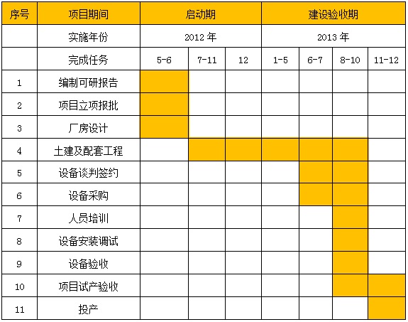 項(xiàng)目總投資主要來自項(xiàng)目發(fā)起公司自籌資金,按照計(jì)劃在2012年3月份前完成項(xiàng)目申報(bào)審批工作。預(yù)計(jì)項(xiàng)目總投資資金到位時(shí)間在2011年4月底。整個項(xiàng)目建設(shè)期內(nèi),主要完成項(xiàng)目可研報(bào)告編制、項(xiàng)目備案、土建及配套工程、人員招聘及培訓(xùn)、設(shè)備簽約、設(shè)備生產(chǎn)、設(shè)備運(yùn)行及驗(yàn)收等工作。