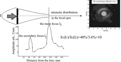 衍射透鏡有兩個焦距:一個主焦距,一個次焦距。主焦距I1/I的衍射效率是40%,次焦距I2/I的衍射效率<3.6%,這個已經(jīng)在實驗中得到了證明。